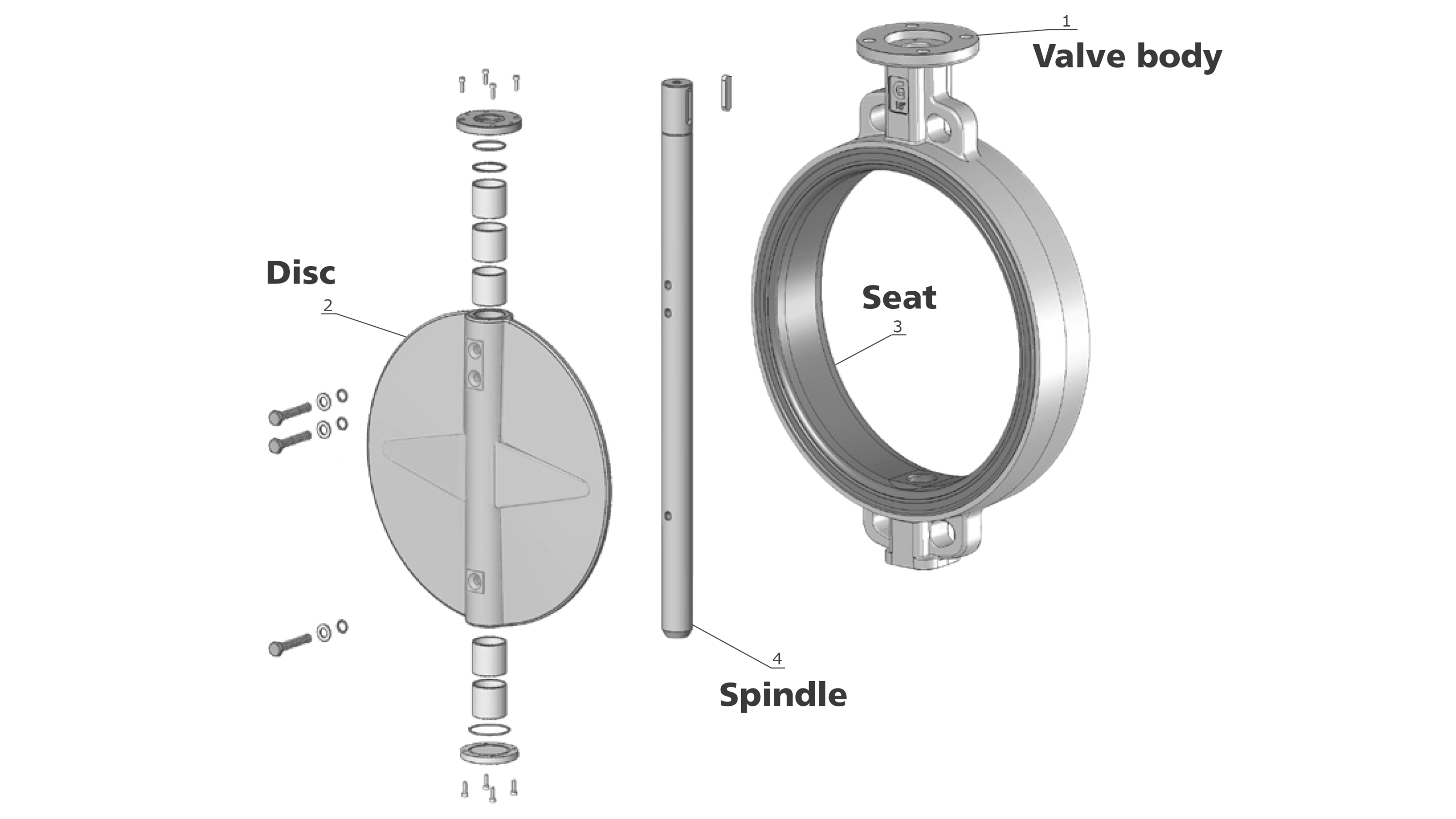 The shaft passes through the body and disc, while the seat and disc work together to seal the flow. Some designs involve friction between the seat and disc, which is why seats are often made of elastomers, though metal-to-metal sealing is also possible.